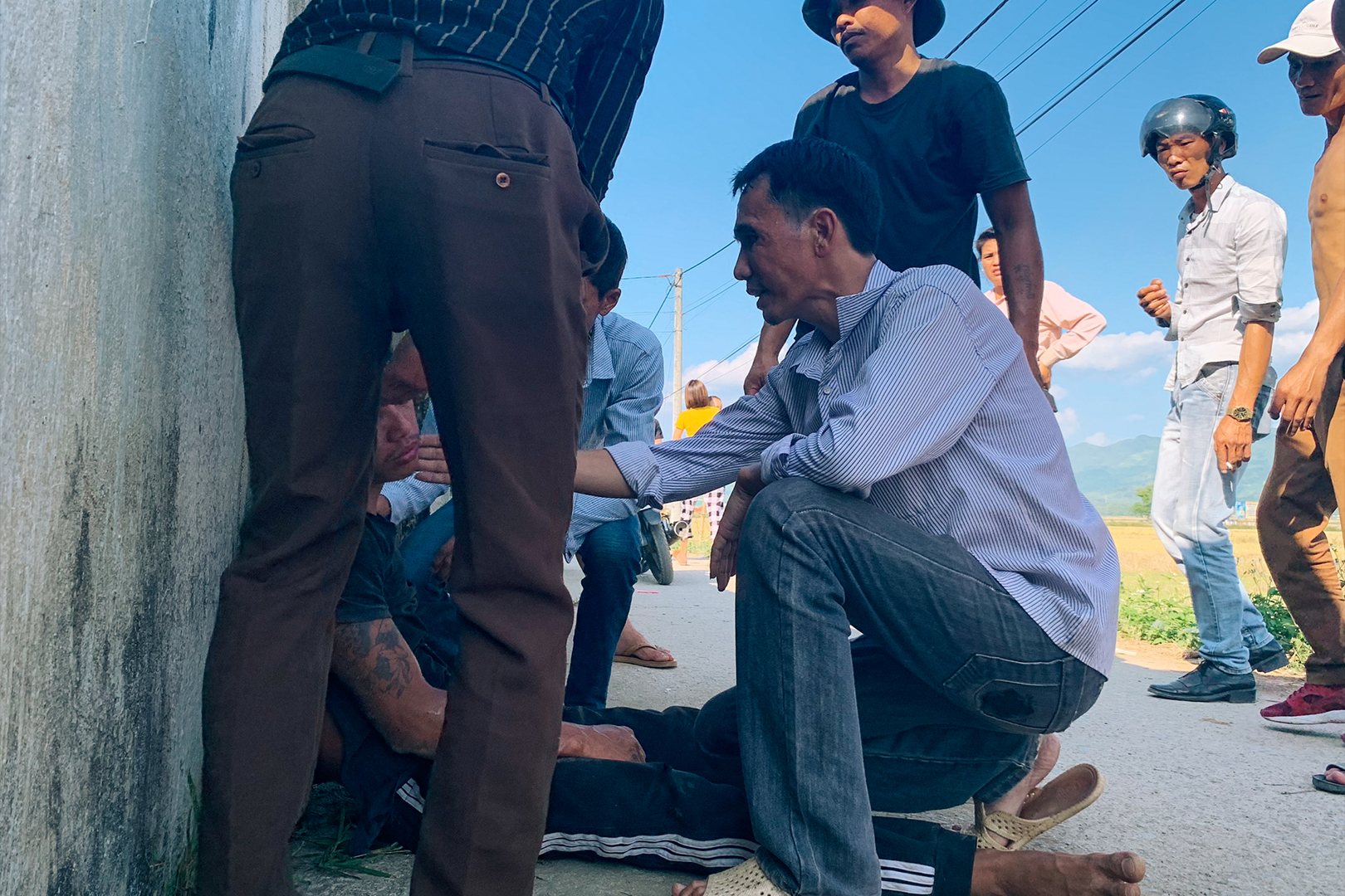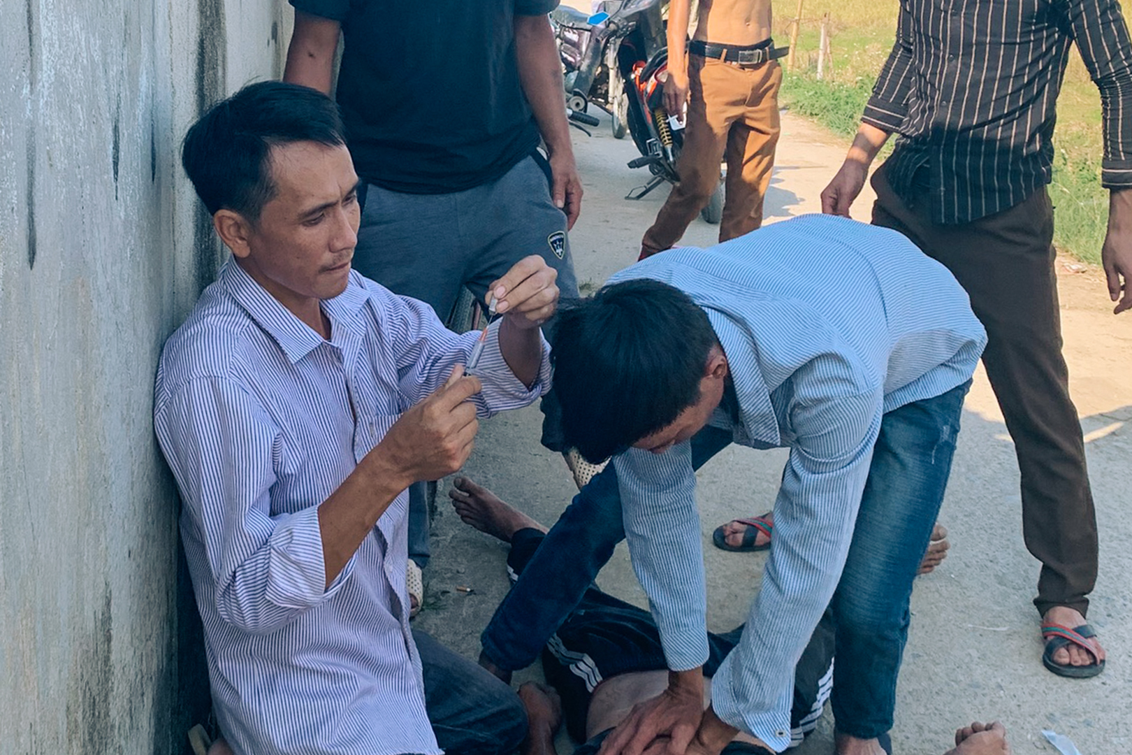 Xa xa một nhóm người nháo nhác, người đàn ông nằm ven đường, bất tỉnh. Các anh chia nhau thực hiện sơ cứu và khẩn trương thao tác tiêm naloxone. “Bệnh nhân ngừng thở. Sơn, ép tim…”
