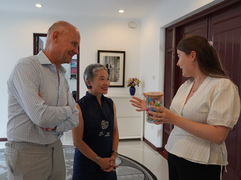 In the process of advocating for the Global Fund to Fight AIDS, Tuberculosis, and Malaria, SCDI visited and met with Mr. Kees Van Baar – Ambassador of the Kingdom of the Netherlands to Vietnam. During the visit, Dr. Khuat Thi Hai Oanh – Director of SCDI presented the ambassador with a picture made from cranes, prepared by the community, and she shared about the impact of the Global Fund on the health and lives of vulnerable groups in Vietnam. Organizations from the Netherlands are close friends and enthusiastic supporters of SCDI.