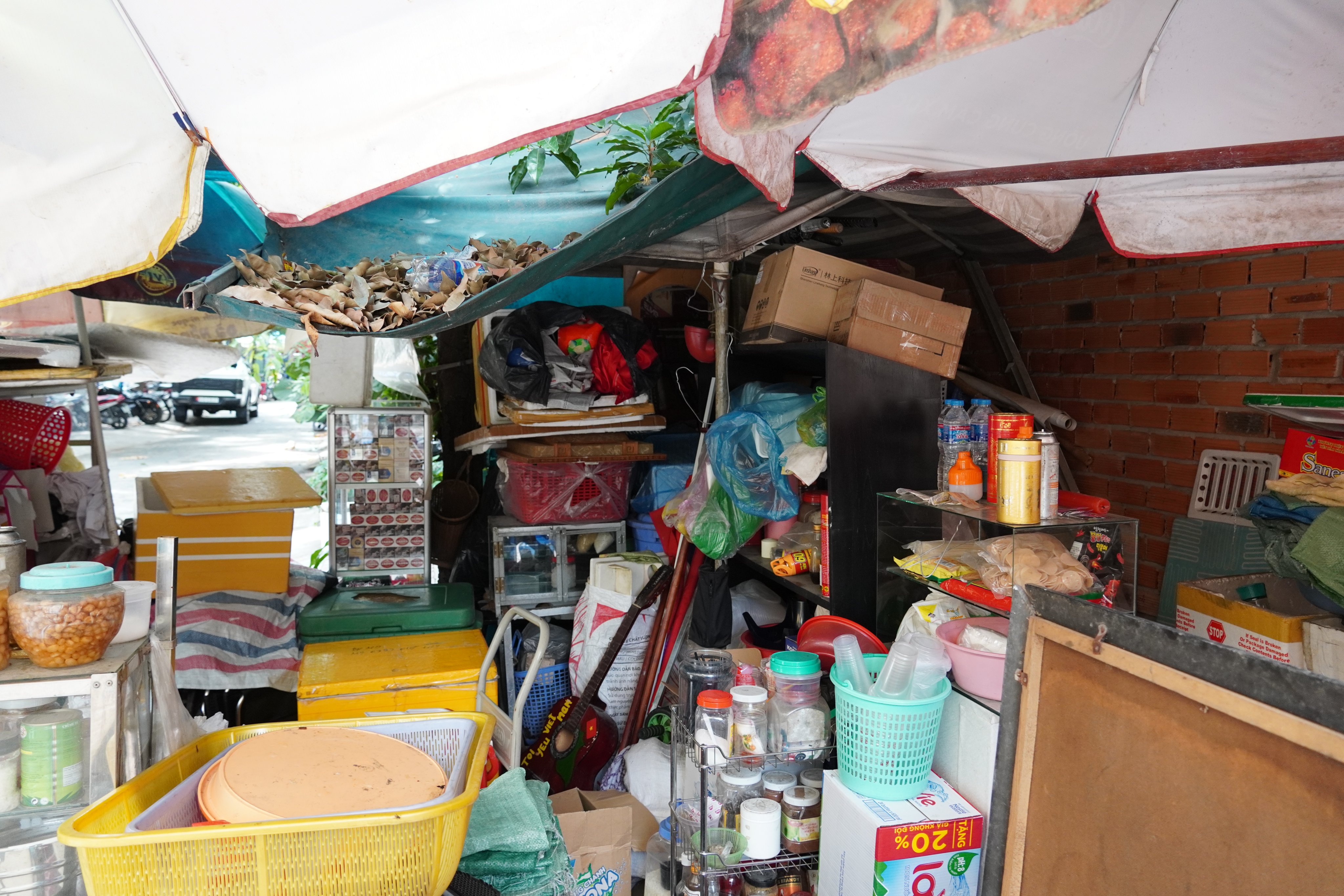 Around three years ago Linh’s father fell ill, so she decided to quit singing and selling lottery tickets (which had been the main source of income for the whole family), and come home to look after her parents. Sadly, however, around the same time her father passed away, her mother was diagnosed with cancer. With no more money, not even enough to pay rent, the family had to turn to and depend on the support of their neighbors, who have allowed them to use a piece of the sidewalk outside of their house for 10 years without complaint. It’s a harsh life, bearing the intensity of Vietnam’s six months of sunshine, six months of rain, with little more than a tarp for protection.