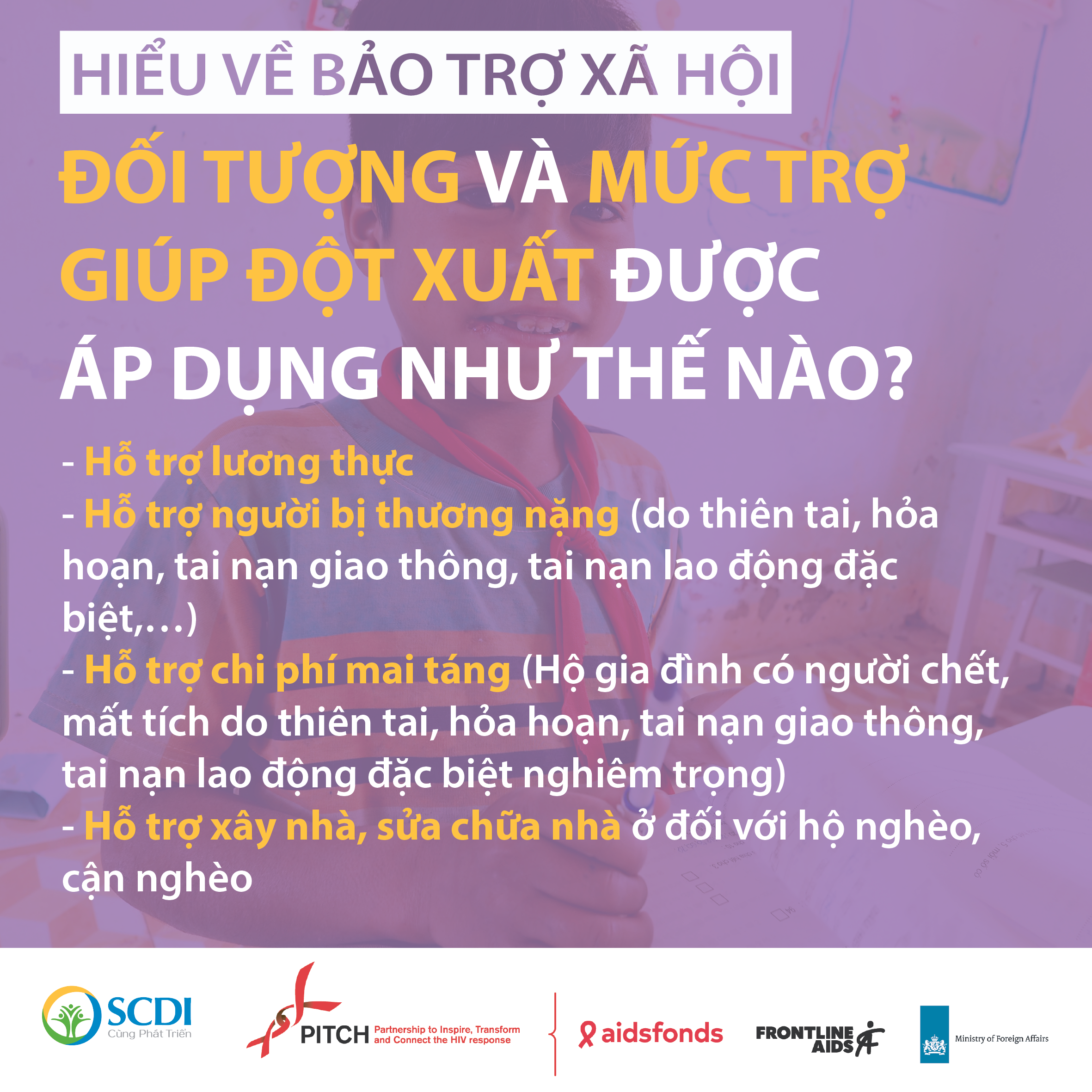Bên cạnh trợ giúp hàng tháng, trợ giúp xã hội còn bao gồm các chính sách trợ giúp trong trường hợp đột xuất để giúp người dân có điều kiện sinh hoạt tối thiểu và vượt qua các hoàn cảnh khắc nghiệt do các yếu tố bất khả kháng gây ra.
