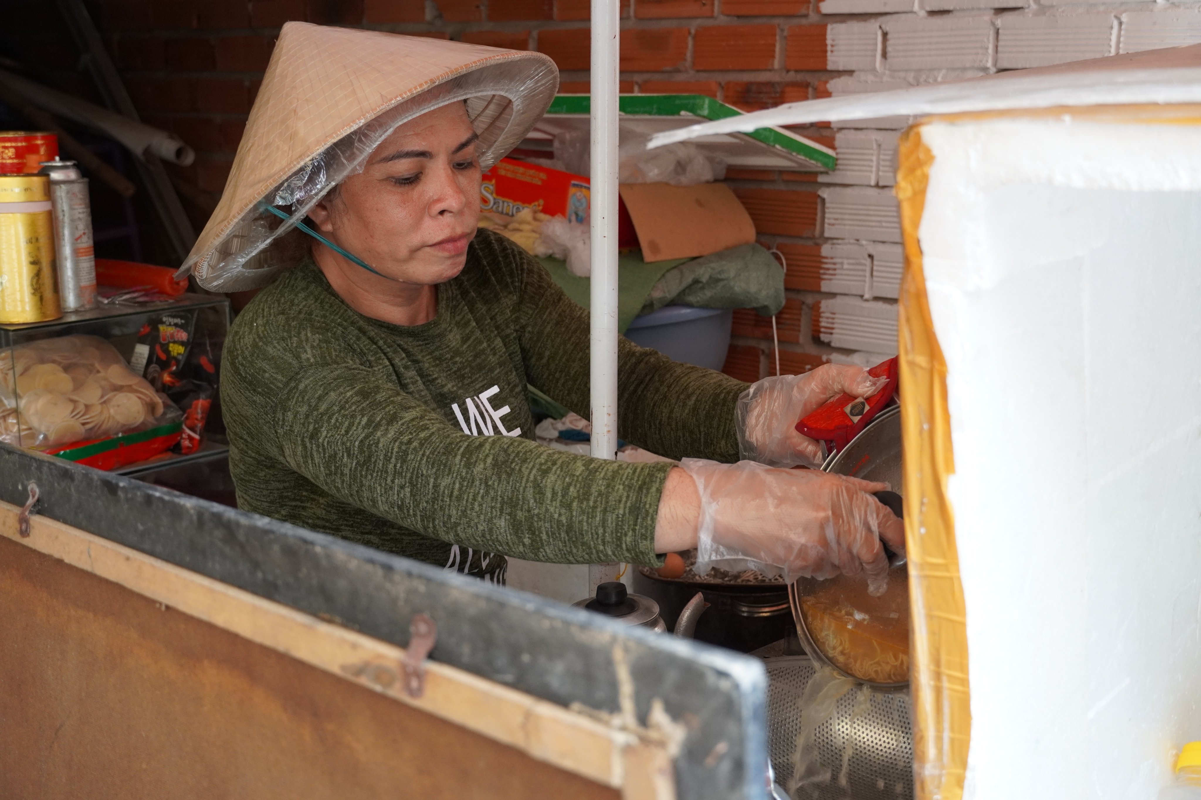 Chị Linh đang làm mì trộn trong chiếc xe hàng tạp hóa, cũng là nơi sinh sống hàng ngày của chị và mẹ.